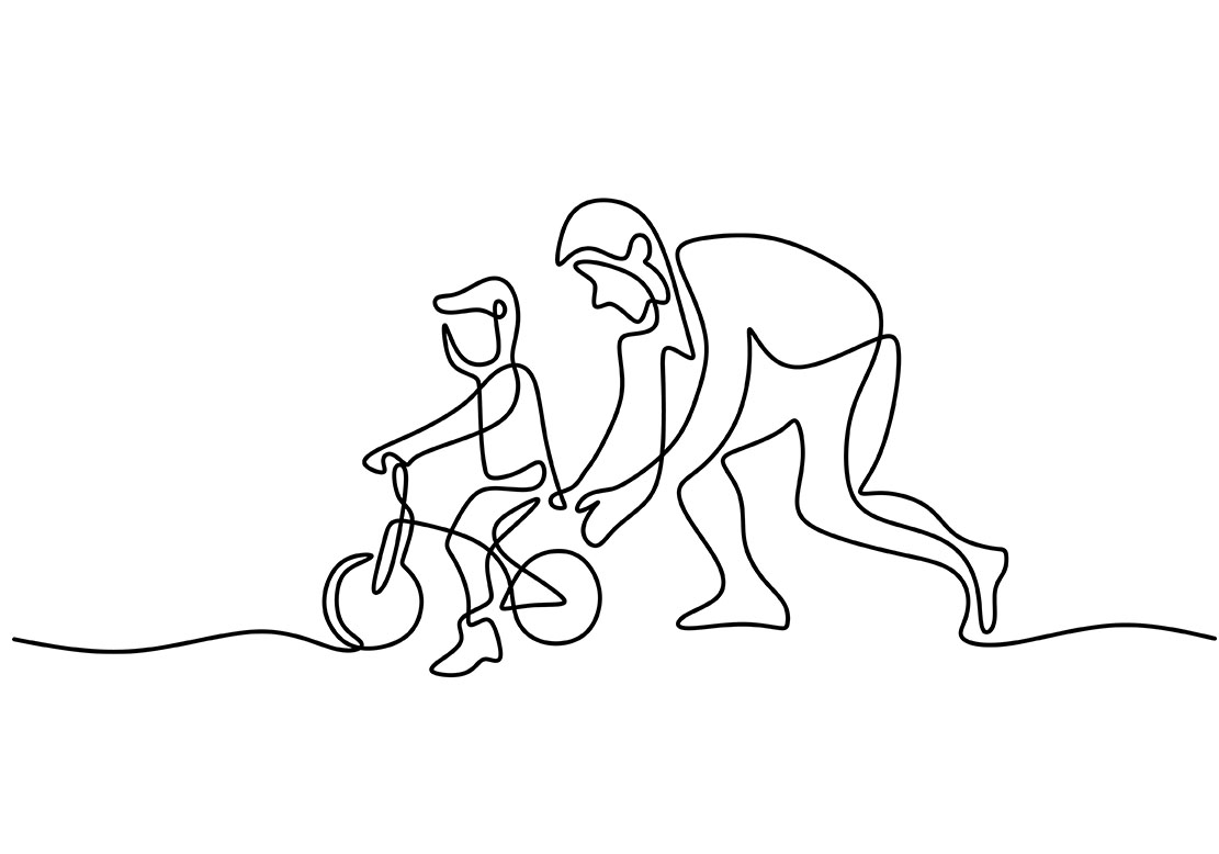 Continuous one single line drawing of young father help his son learning to ride a bicycle in the field together. Happy parenting concept. Character dad teach his son riding bicycle...