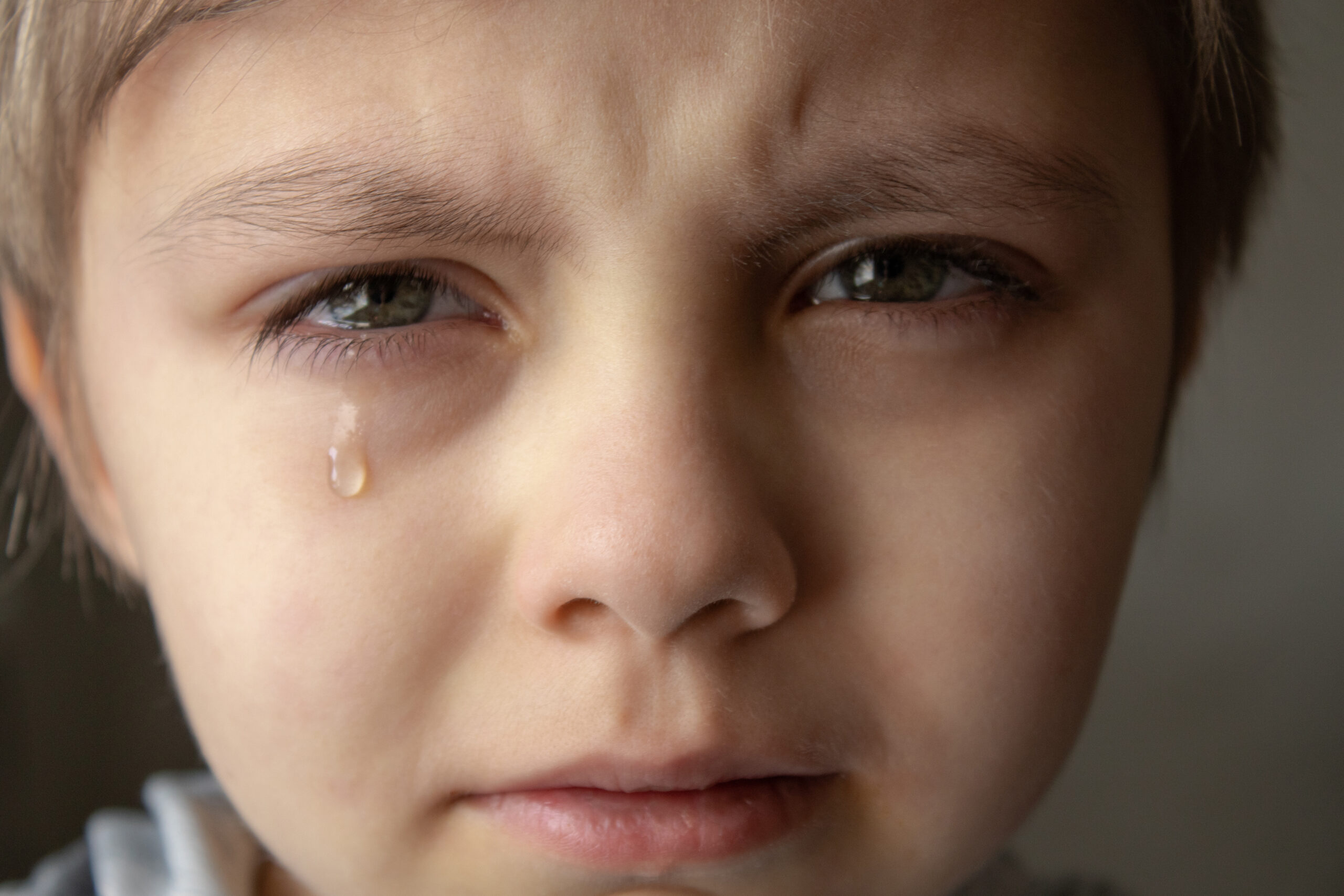 Tears in the eyes of a child. A tear on the boy’s cheek.